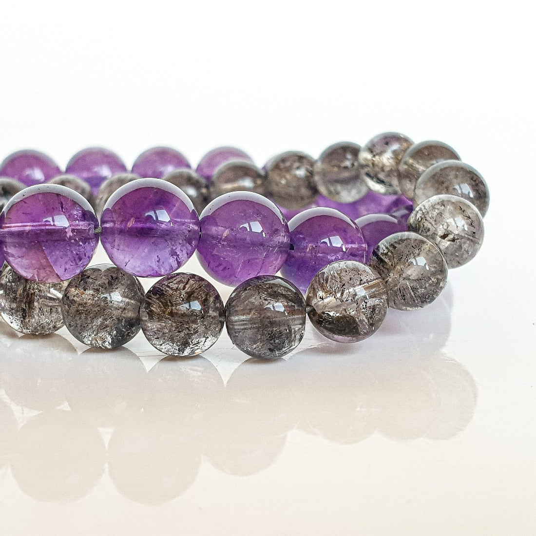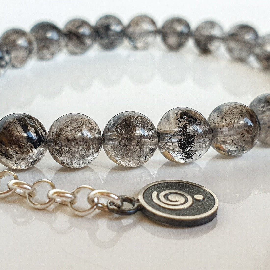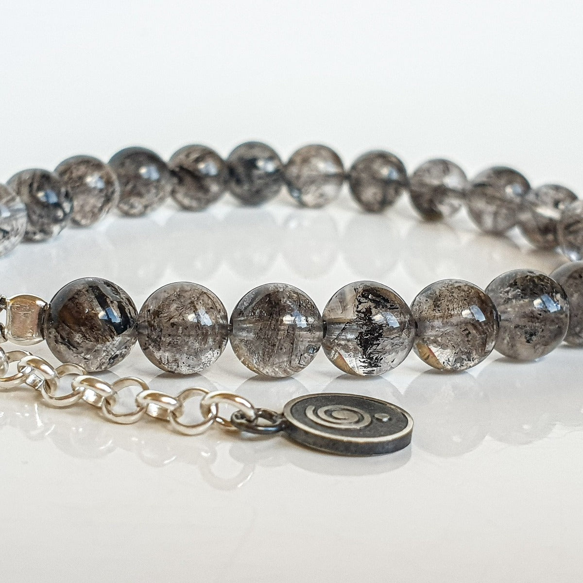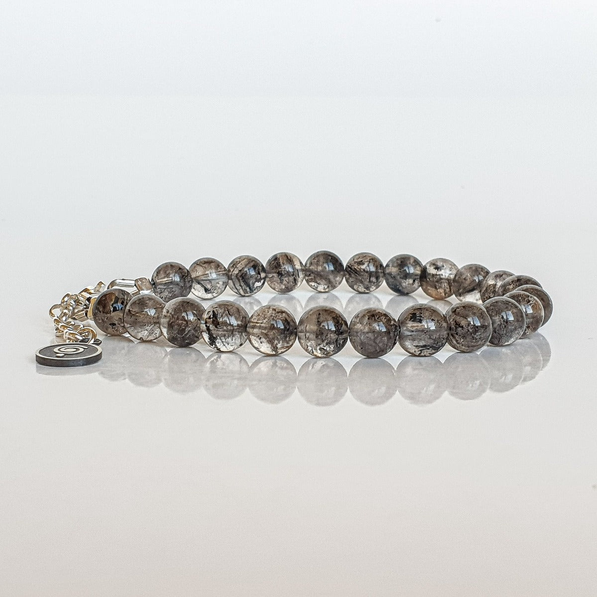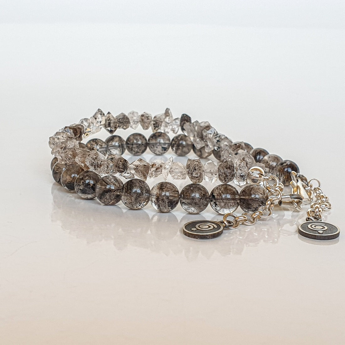 ! Herkimerio deimanto apvalių karoliukų dydis 7-8 mm. Kiekviena apyrankė yra unikali. Karoliukuose esančių anglies nuosėdų kiekis dėl natūralaus akmens unikalių savybių kažkiek skirsis nuo pavaizduotų fotografijoje.