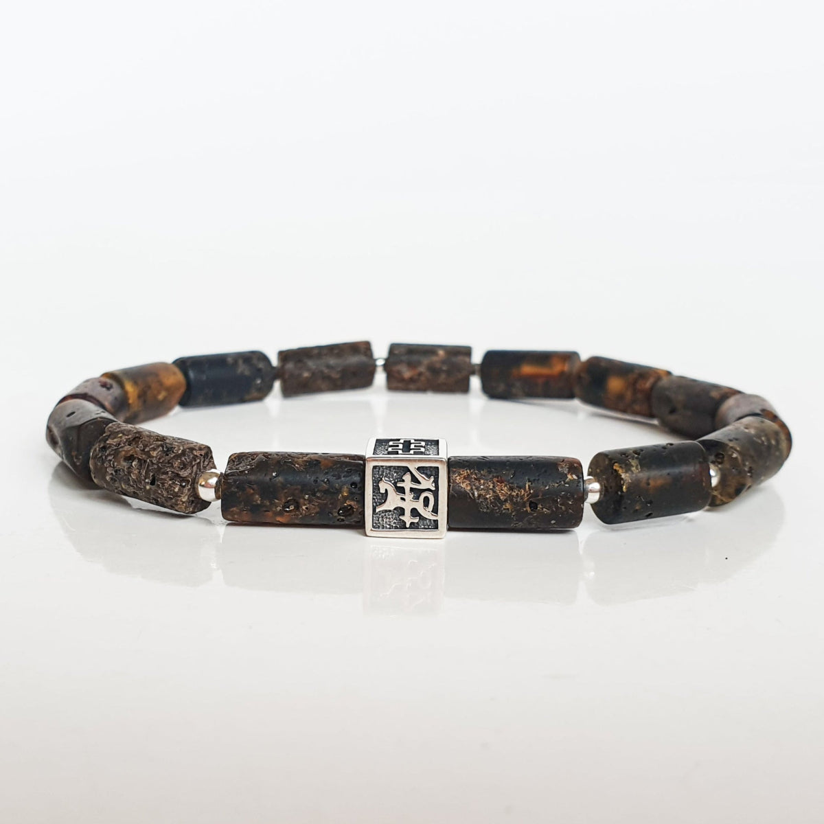 Bracelet with brown Baltic amber beads and a silver Vytis on a white background