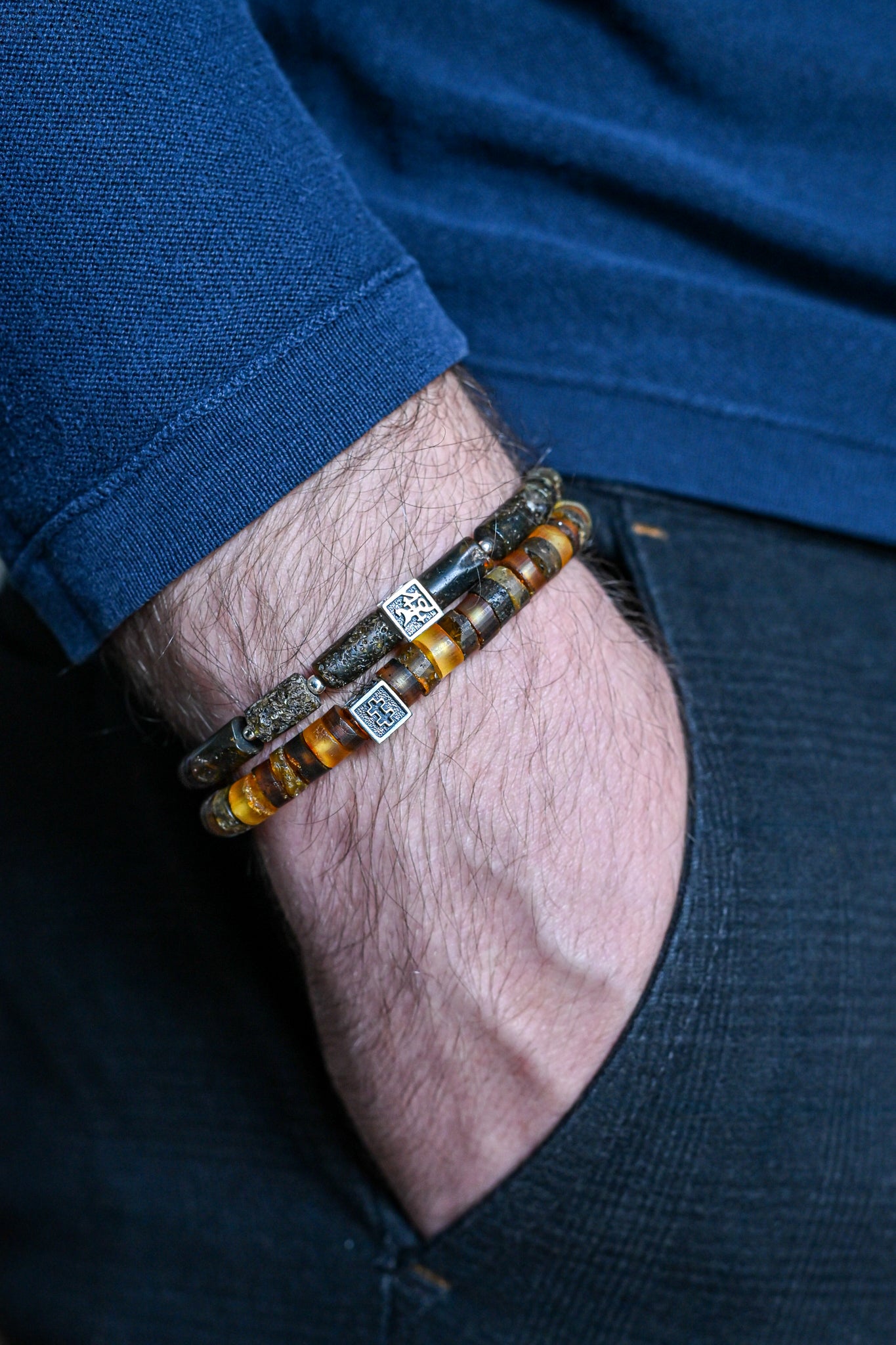 Man in a blue suit with amber necklace and bracelet is sitting on a couch in a neutral setting