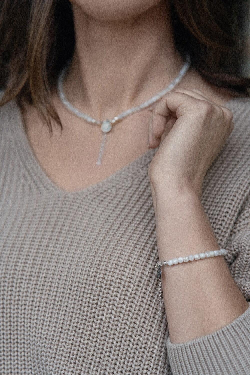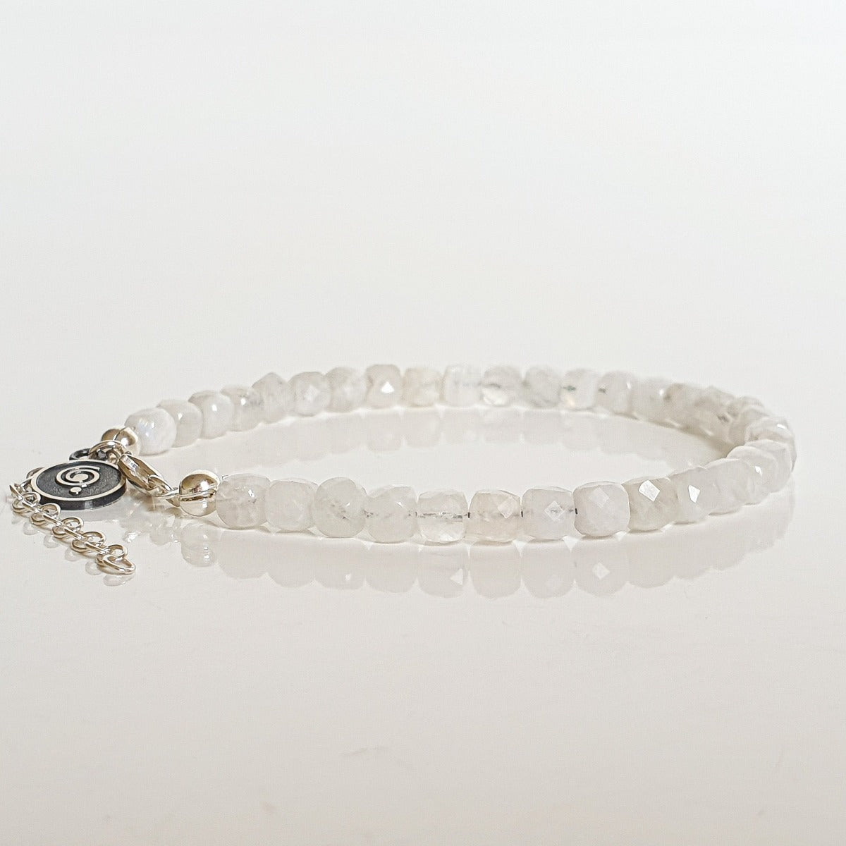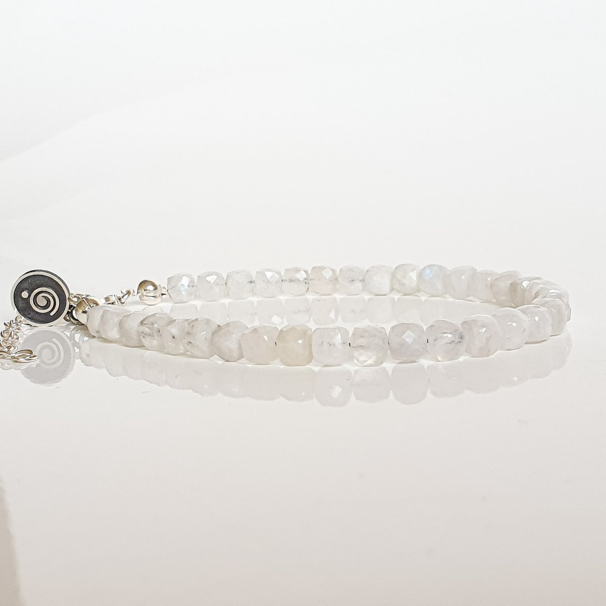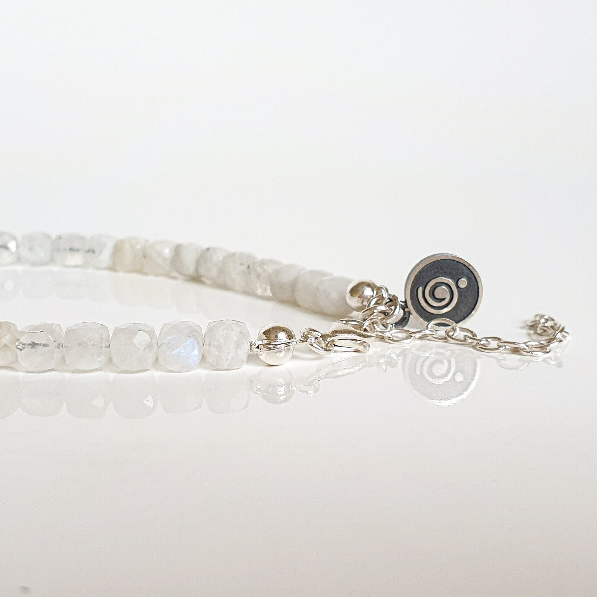 Natūralaus mėnulio akmens ir sidabro 925 apyrankė moterims. Mėnulio akmens tema - dvasinis augimas, emocijų raminimas, intuicija.
