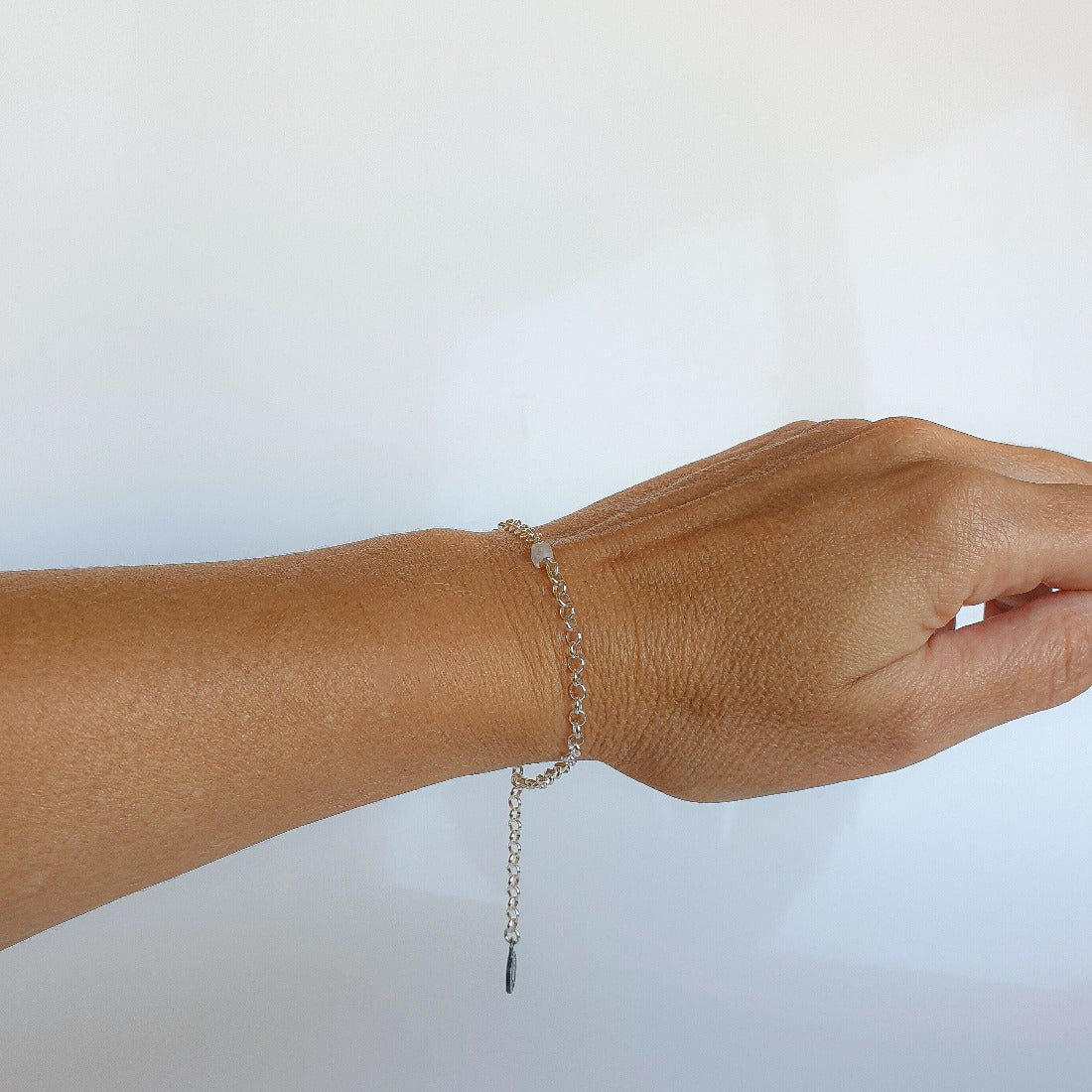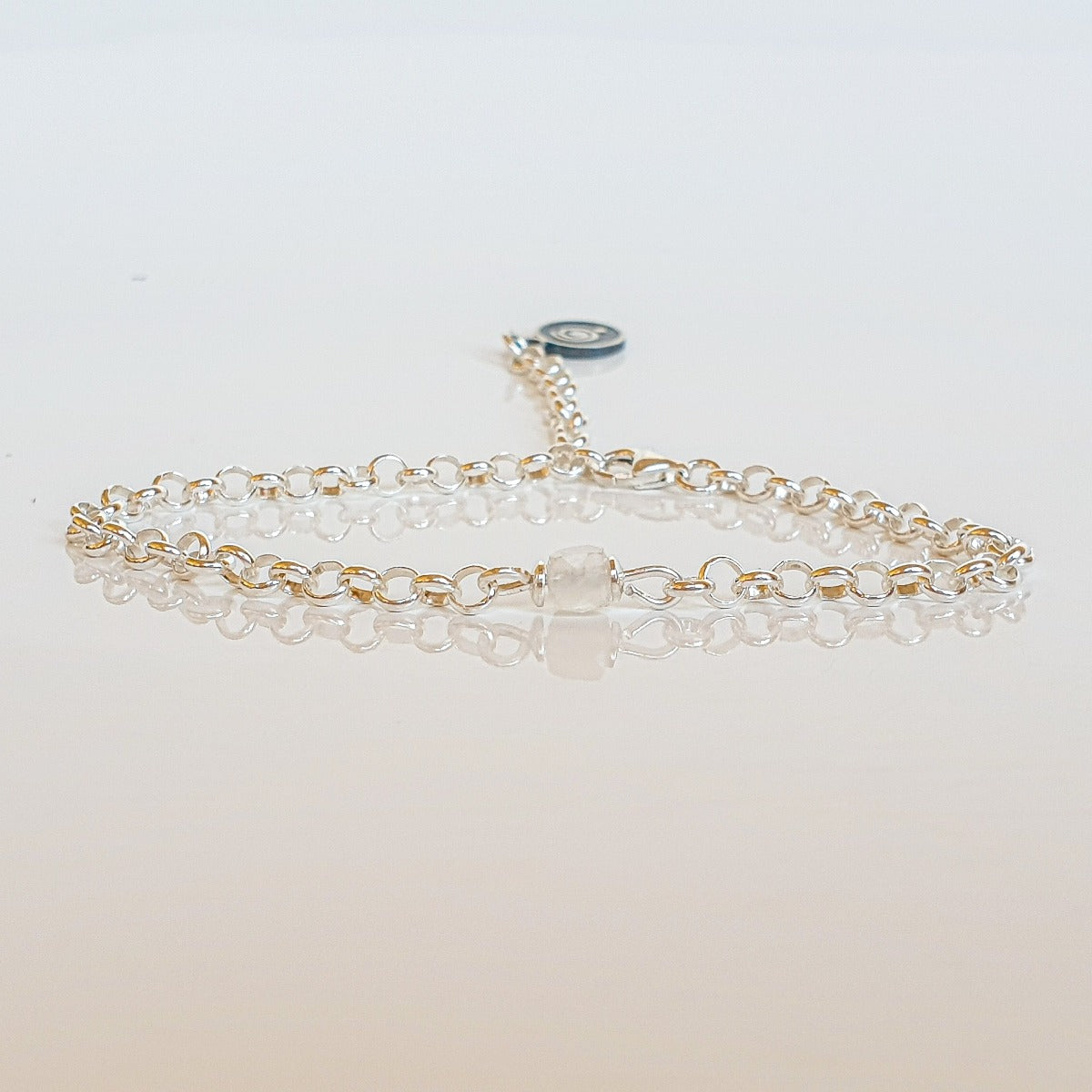 Mėnulio akmenuko dydis 4,4 mm. Subtili apyrankė tinka nuo S iki XL dydžio riešui.