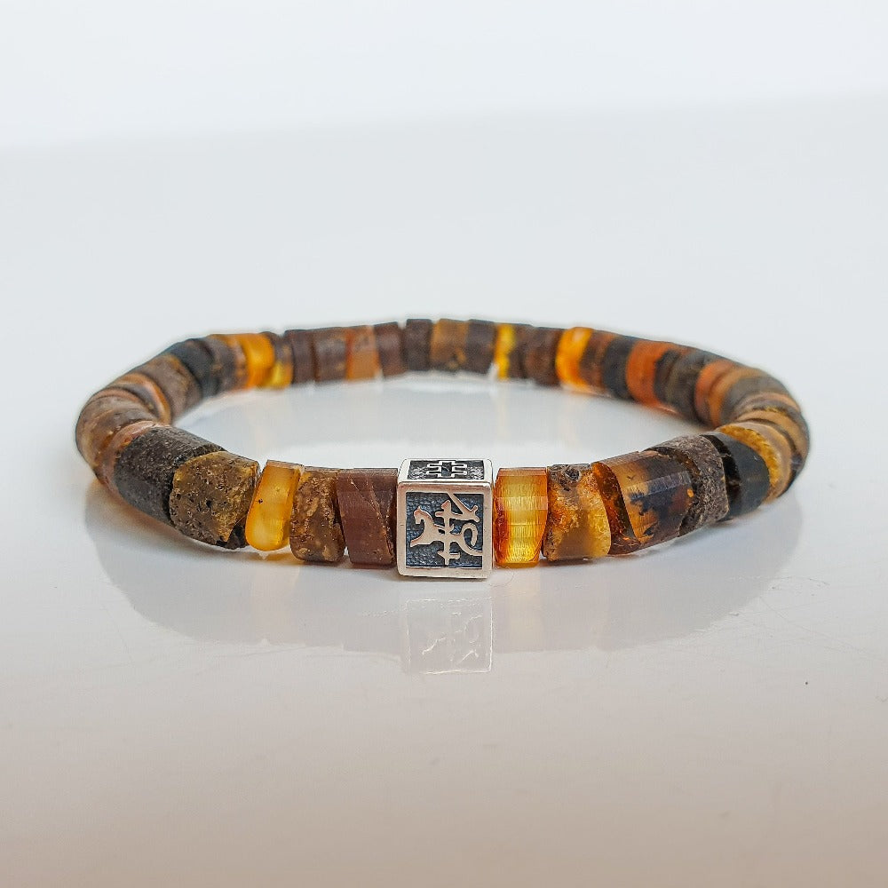 Bracelet with natural amber. It has an accent handcrafted charm “Vytis” made of 925 silver (~2,20 g). Total weight of bracelet is from 9-12 g.