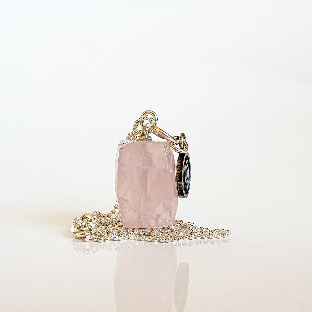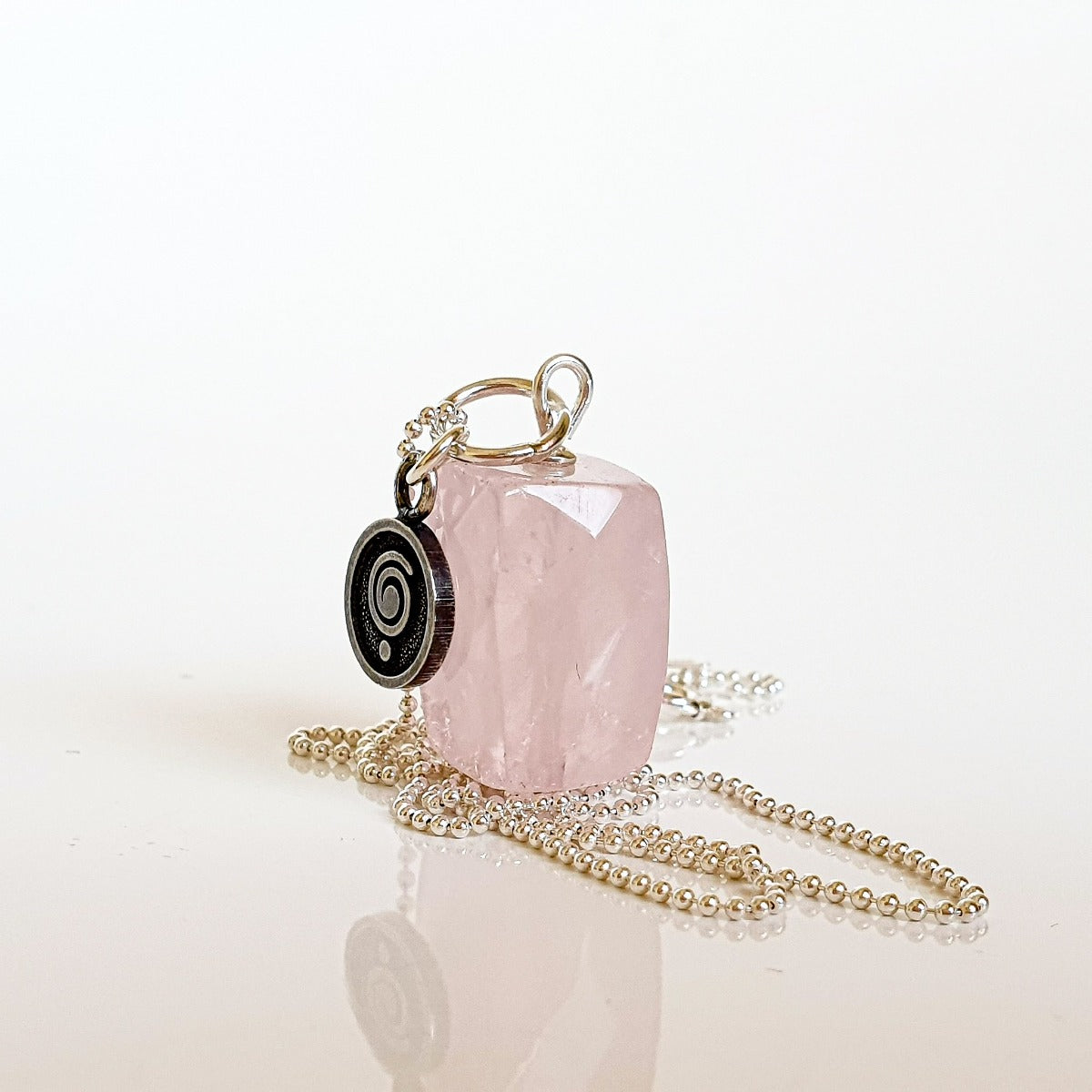 Pink quartz size is 16 x 11 x 11 mm, place of origin Madagascar. Comes with 45 cm or 60 long silver chain. In photo model wears 45 cm long silver chain.