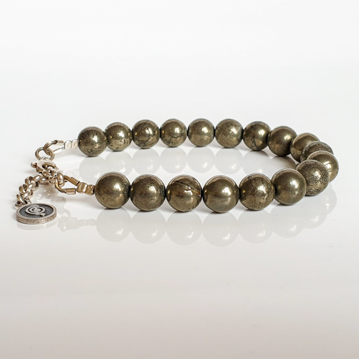 This bracelet for women with 8 mm natural Pyrite beads protects. Pyrite is a good support when someone is concerned, feeling frustrated, having no plans, or even feeling desperate - it raises energy and helps overcome fatigue. It is also a very positive stone. It helps to overcome inertia and gives you self-confidence, frees you from superficiality, reveals your inner abilities and encourages the influx of new ideas.